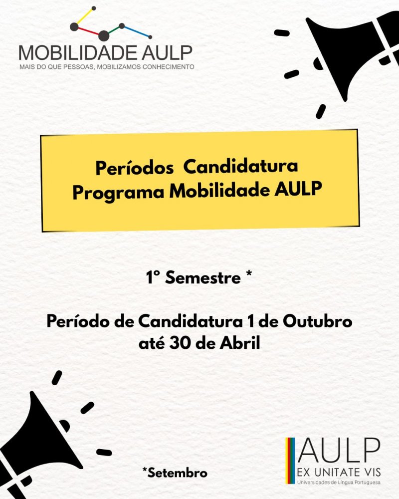 A Associação das Universidade de Língua Portuguesa (AULP) anuncia que tem aberto até ao dia 30 de Abril de 2026 o período de candidaturas para o Programa de Mobilidade AULP